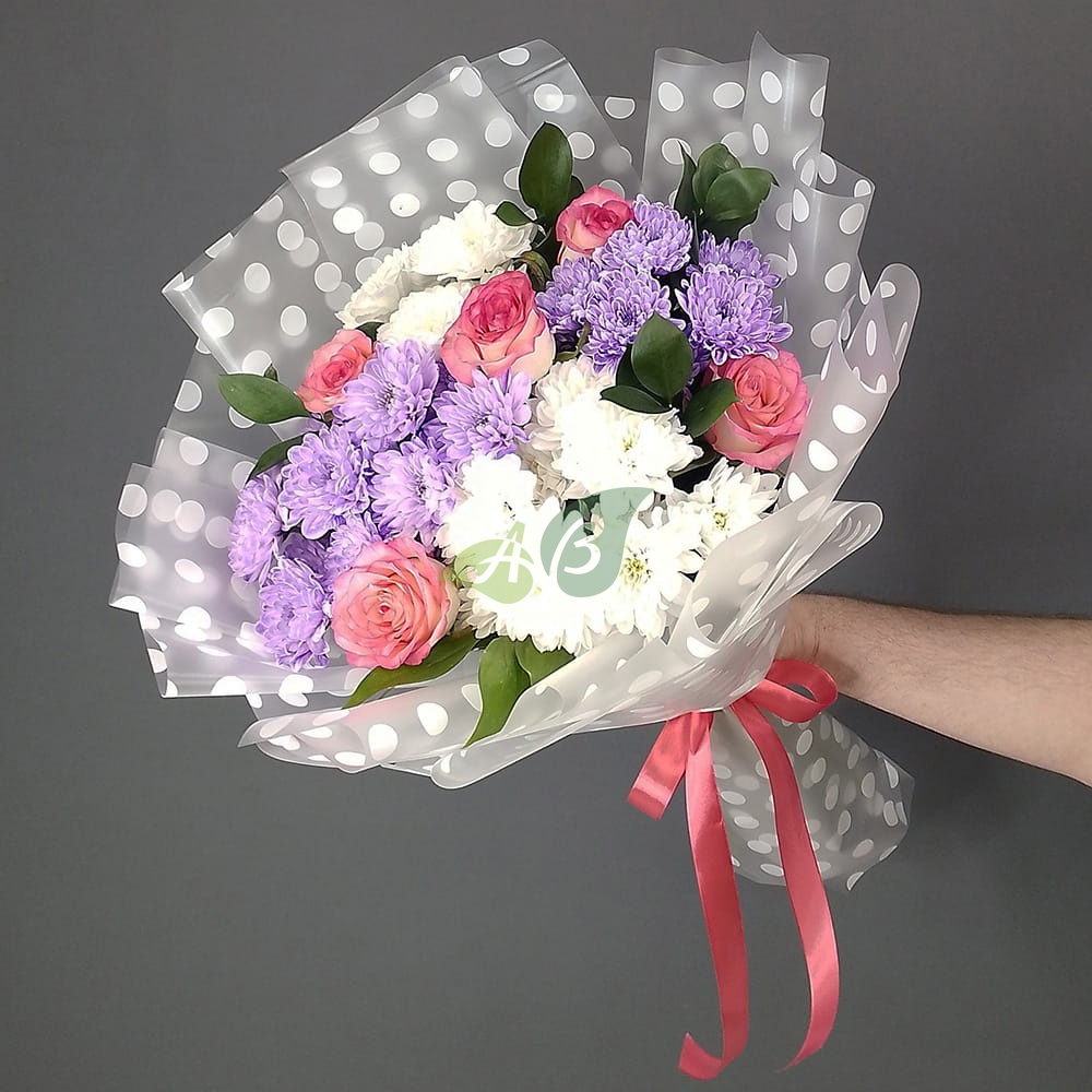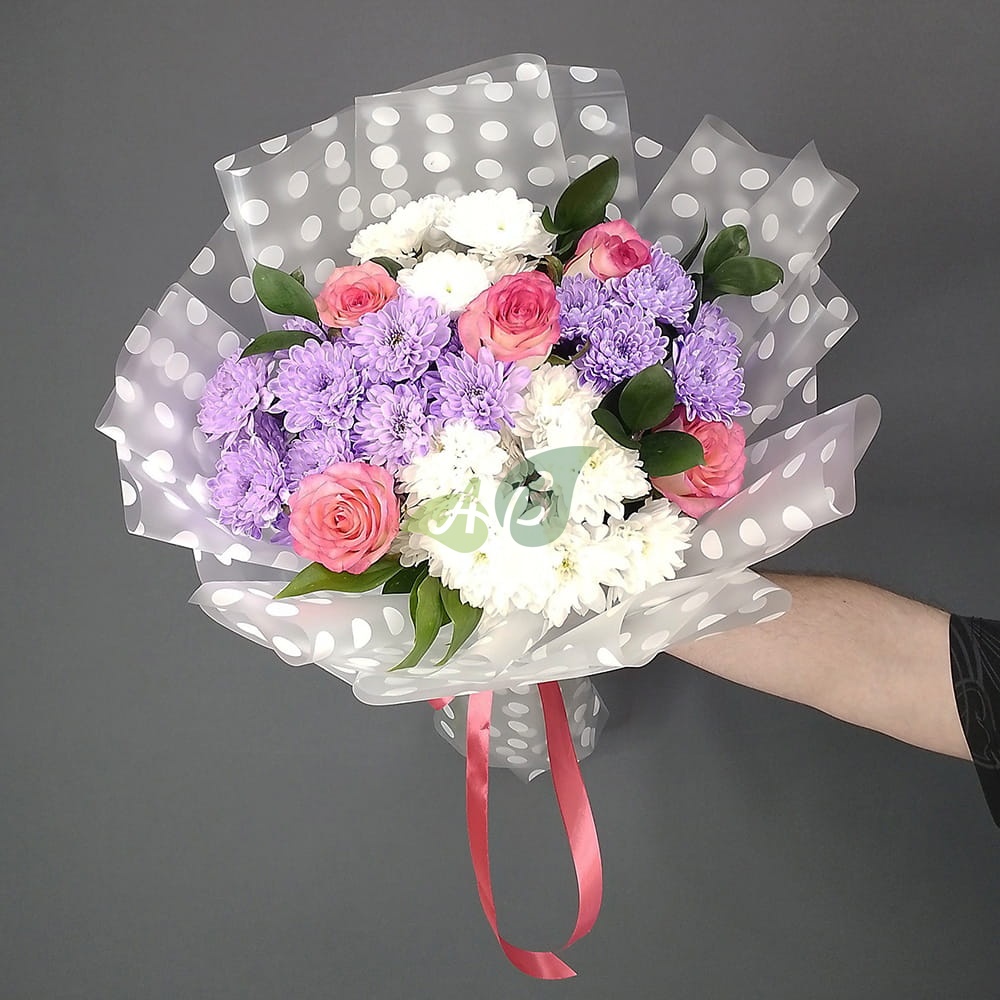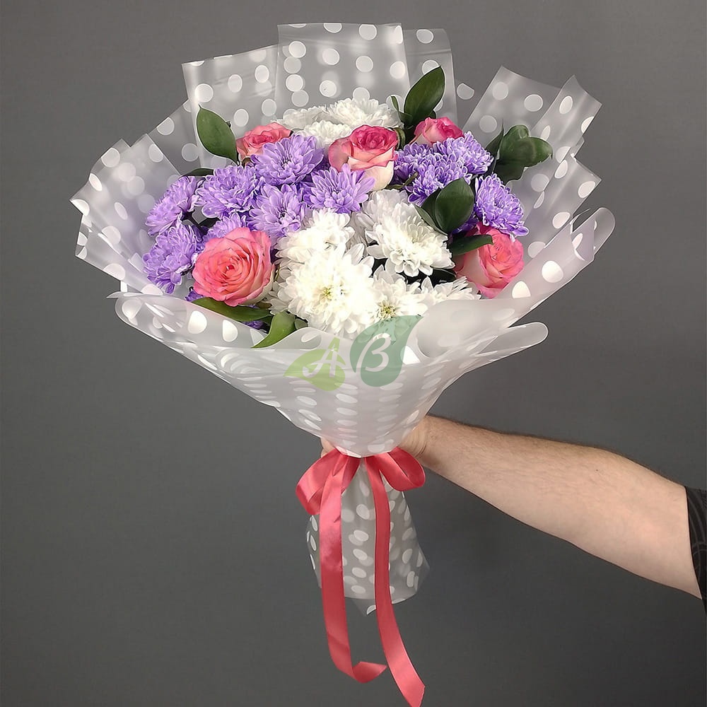 Состав и характеристики букета из роз и хризантем "Летние воспоминания":